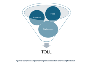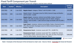 A “simplified” structure (fixed + variable) is often published to provide predictability for maritime operators; for example, you can have a fixed part, like the vessel size category (Regular, Super, Neopanamax), and then also a variable part based on the capacity of the vessel, which is different if we talk about crude oil tankers (metric tons MT) rather than container’s vessels (TEUs).